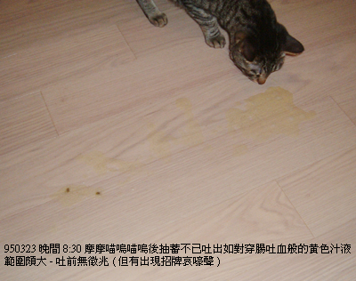 (因新浪機車毛的蛋蛋,紀錄不見了。總之一週內渣有兩次咳十數下的紀錄,且另一次有一小口未消化飼料也疑似渣渣吐的;摩則吐了兩次,一次飼料一次黃水....)